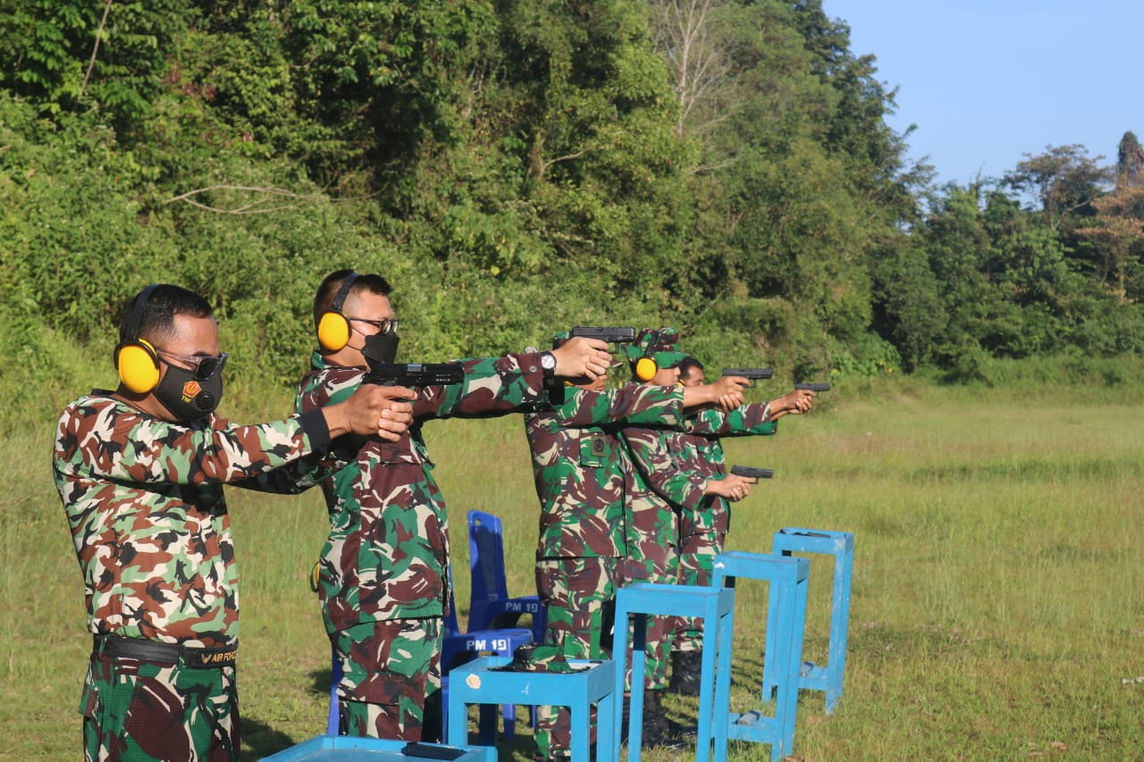BKc/Palembang- Dibawah pengawasan Operasi Latihan (Opslat) Lanud Sri Mulyono Herlambang, Mayor Lek Edi Susanto, para perwira, anggota Satuan Polisi Militer Angkatan Udara (Satpomau) dan anggota Intelpam Lanud Sri Mulyono Herlambang gelar latihan menembak pistol di lapangan tembak Lanud SMH. Selasa (27/7/2021).